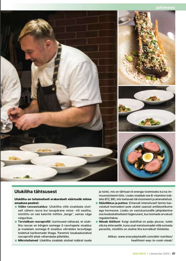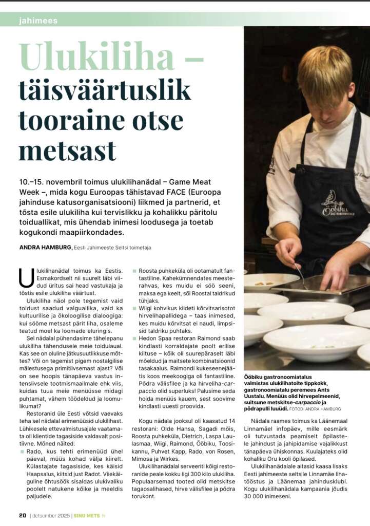 2024 arutasime Linnamäe LT juhatuse liikme Indrek Loorensiga, et võiks 2025 aastal Läänemaal korraldada Euroopa FACE eeskujul ulukiliha nädala. Populariseerida seeläbi seda kohalikku, tervislikku toorainet ja meelde tuletada, et jahipidamine ja ulukiliha toiduks tarvitamine on meie iidsed traditsioonid ja kindel osa meie kultuurist! Mõeldud, tehtud. Projekti asus juhtima Mihkel Loorens, kaasasime EJS-i ja nii toimuski esmakordselt Eestis 10-15 Novembril Ulukiliha nädal, kus kaasa lõid mitmed restoranid üle Eesti. Allpool EJS toimetaja Andra Hamburgi ülevaade, mis ilmus ajakirjas Sinu Mets detsembris 2025.